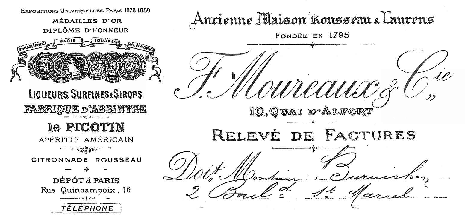 En 1795 une fabrique d’absinthe est créée à Paris (elle va devenir la distillerie Rousseau et Laurens) située rue Quincampois à proximité de la distillerie Moureau. En 1875 les 2 distilleries fusionnent et un transfert progressif de l’entreprise sera effectué à Maisons-Alfort, 10, quai d’Alfort.