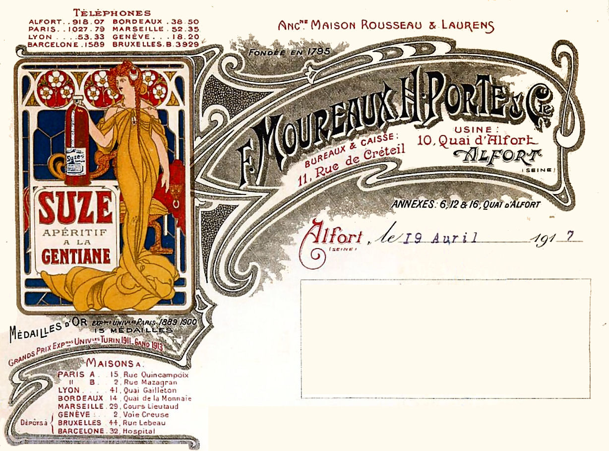 En 1904 : l’entreprise occupe 40 ouvriers et employés, non compris les courtiers, à la fabrication de l’absinthe, des liqueurs et sirops de toute nature. Sa principale spécialité consiste dans la gentiane Suze, apéritif tonique à base de gentiane fraîche du Jura. Cet établissement dispose d’une machine de 25 chevaux, d’un moteur hydraulique actionnant les rinceuses mécaniques, et possède, pour ses transports, 12 chevaux et 7 voitures. Ses affaires se font pour les 3/4 à Paris et dans le département de la Seine et, pour le reste, en province et à l’étranger.