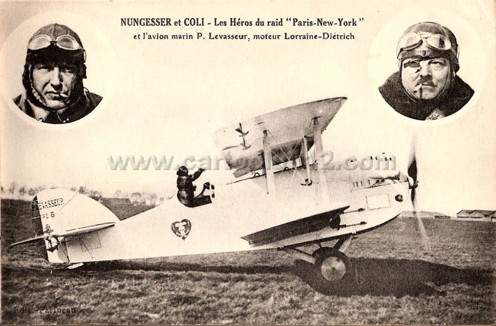 Nungesser et Coli, qui ont tenté la première traversée de l’Atlantique sans escale en 1927, à bord de l’Oiseau blanc. Partis du Bourget le 8 mai, ils ont disparu en mer sans laisser de trace, quelques jours avant que Lindbergh ne réussisse l’exploit inverse. Leur destin tragique a ému la France entière et a fait d’eux des héros de l’aviation.