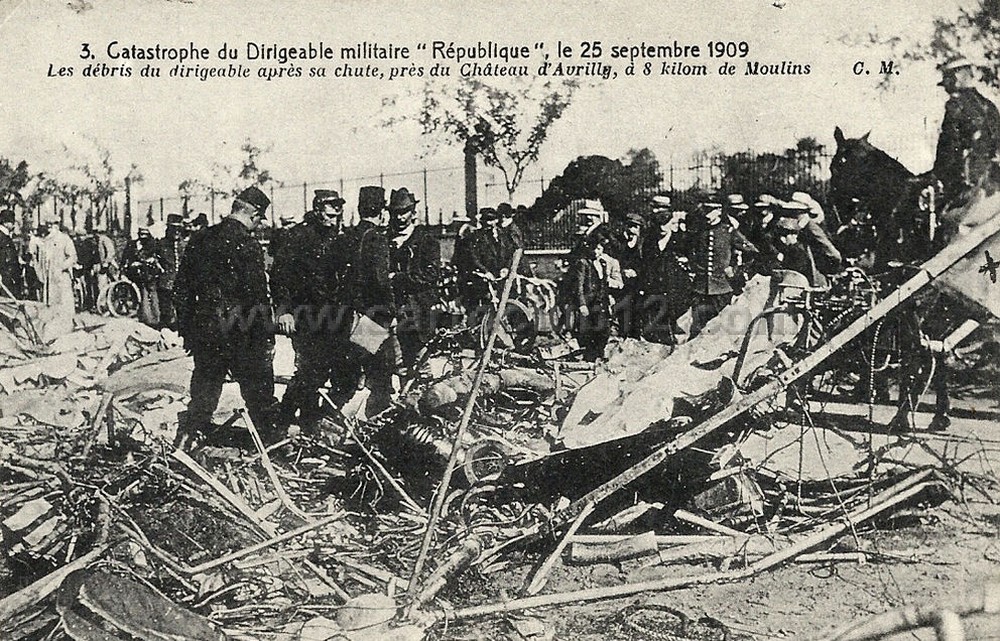 Le 25 septembre 1909 marque une date tragique dans l’histoire de l’aéronautique française avec la catastrophe du dirigeable "La République". Ce jour-là, lors des grandes manœuvres militaires d’automne, le dirigeable s’écrasait près de Moulins, entraînant la mort de tout son équipage. Construit par la société Lebaudy Frères et mis en service en juillet 1908, "La République" était un dirigeable militaire français, propulsé par un moteur Panhard-Levassor de 52 kW. Il mesurait 61 mètres de long et avait un diamètre de 10,09 mètres, avec un volume de 3 700 m³.