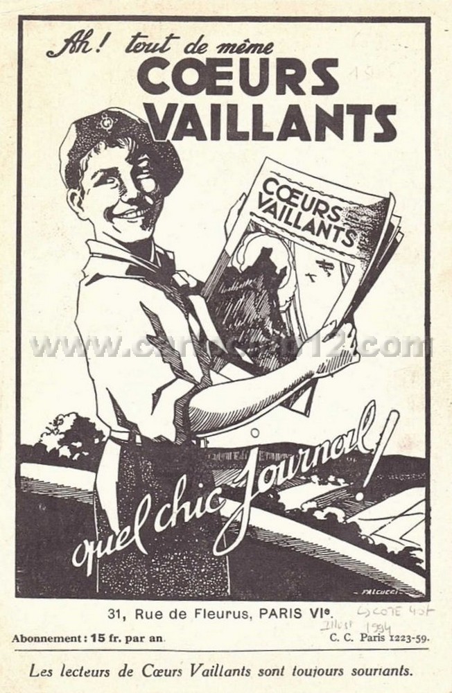 Fondée en 1929 en France, "Cœurs vaillants, le journal des patronages" est un journal catholique destinée aux jeunes garçons (le magazine "Âmes vaillantes", destiné aux filles, ne sera créé qu’en 1937), marquée par son ambition de transmettre des valeurs chrétiennes et morales à travers des récits captivants, des bandes dessinées, et des textes éducatifs. À l’origine soutenue par l’Église catholique, cette publication visait à inculquer un sens du devoir, de la solidarité, et de la foi chez ses lecteurs.