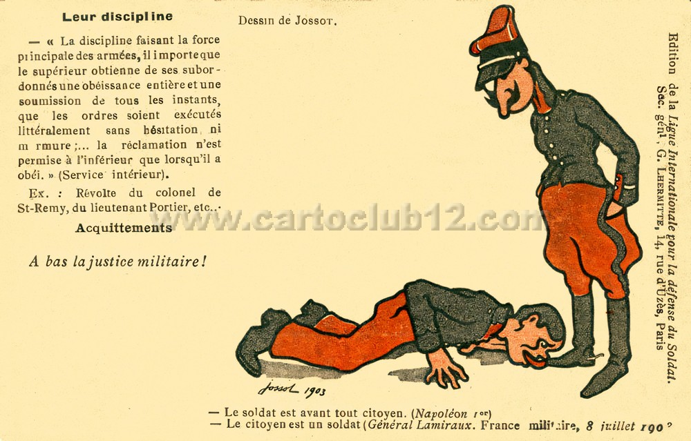 La Ligue Internationale pour la Défense du Soldat, est fondée en 1902, suite aux révélations sur l’affaire Dreyfus, comme pour la Ligue des Droits de l’Homme en 1898. Elle aura pour objectifs de dénoncer les abus et les injustices que subissent les militaires dans le cadre de leur service.